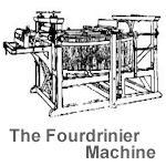 The Fourdrinier Machine - Papermaking machine patented by the Fourdrinier brothers Henry and Sealy in England in 1803. On the machine, liquid pulp flows onto a moving wire-mesh belt, and water drains and is sucked away, leaving a damp paper web. This is passed first through a series of steam-heated rollers, which dry it, and then between heavy calendar rollers, which give it a smooth finish.